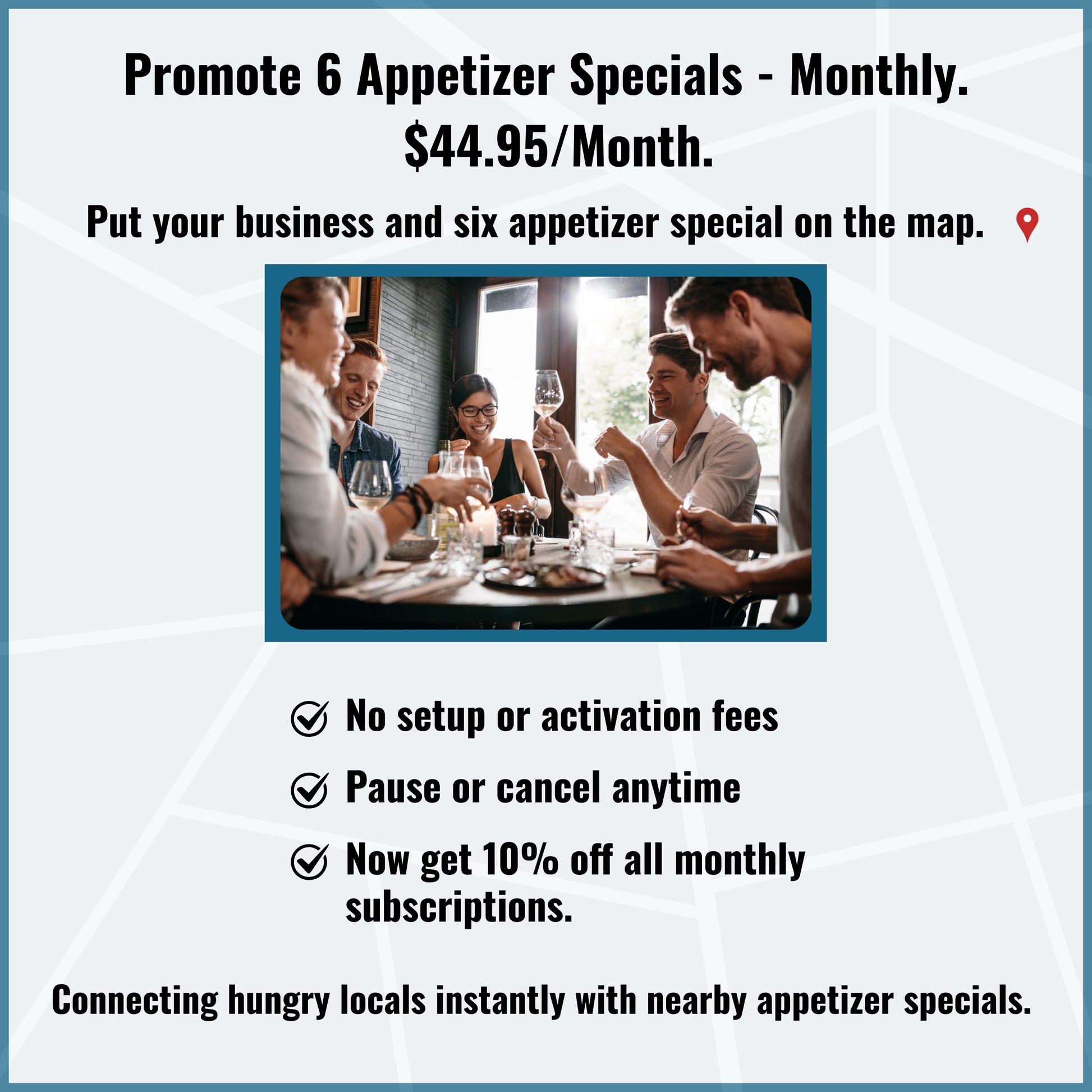 Our location-based interactive marketing platform helps businesses attract more attention to their appetizer specials. Food lovers can instantly discover nearby appetizer specials on Google Maps using their phones, making it easy to find and enjoy great offers right away.